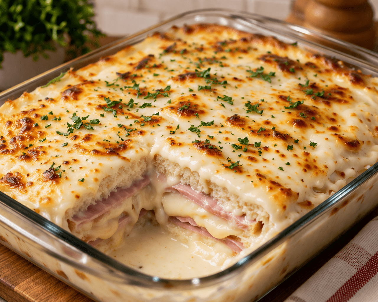 Misto quente de forno generoso com camadas de queijo, presunto e molho branco gratinado