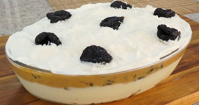 5. Monte na travessa com creme de coco e calda de ameixa.